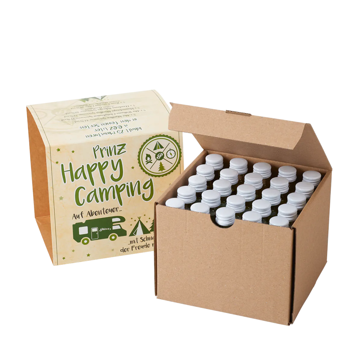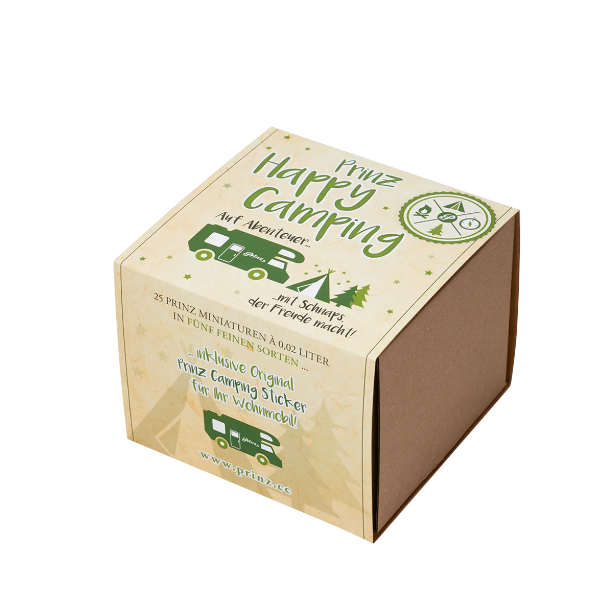 Ob am Lagerfeuer, beim Zelten oder auf dem Roadtrip – die Happy Camping Box von Prinz bringt Stimmung in jede Outdoor-Runde! Mit 22 hochwertigen Schnaps-Miniaturen und dem beliebten Kartenspiel „Prinz Schnaps!“ ist sie das perfekte Geschenk für Camping-Fans und Genießer.